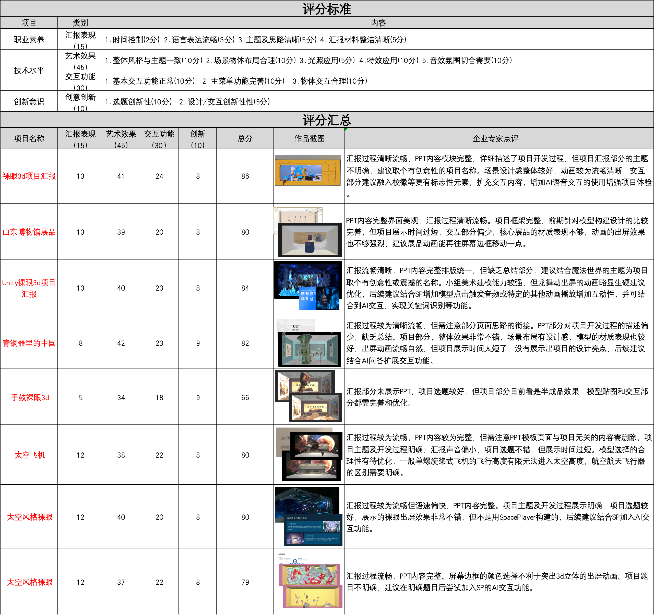 本次项目涉及裸眼3D立体空间开发技术应用,旨在提升学生对数字城市、三维设计、虚拟现实等技术的实践能力。评审组依据艺术效果、交互功能等标准对作品进行打分,来看看作品和评分!