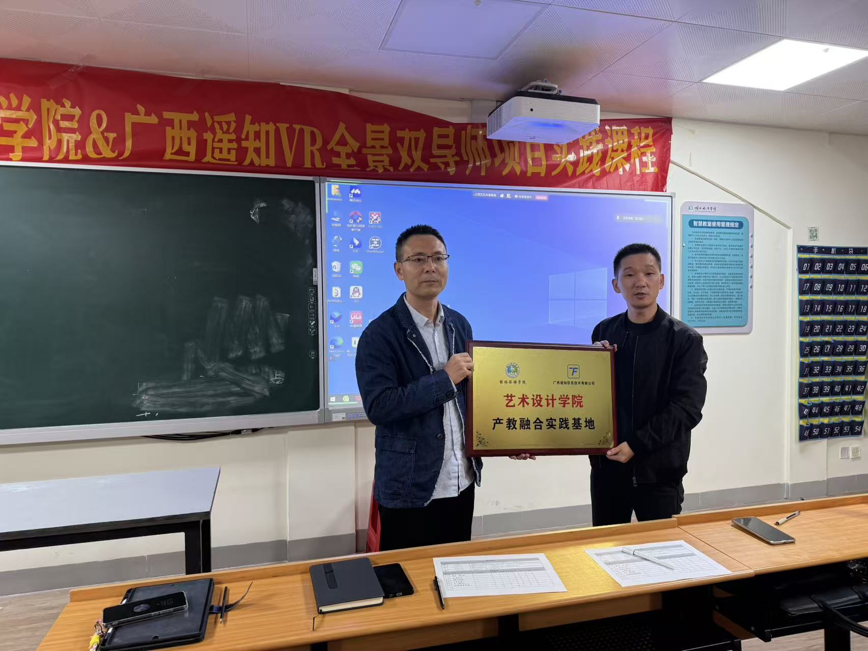 时值桂林旅游学院建校40周年华诞之际,桂林旅游学院与广西遥知的合作迈入新阶段。双方联合开展的“VR全景双导师项目实践课程”结课汇报活动于近期圆满结束。在活动仪式上,企业代表与艺术设计学院领导共同为“艺术设计学院产教融合实践基地”揭牌,标志着双方在深化产教融合、推动应用型人才培养方面取得了重要成果。