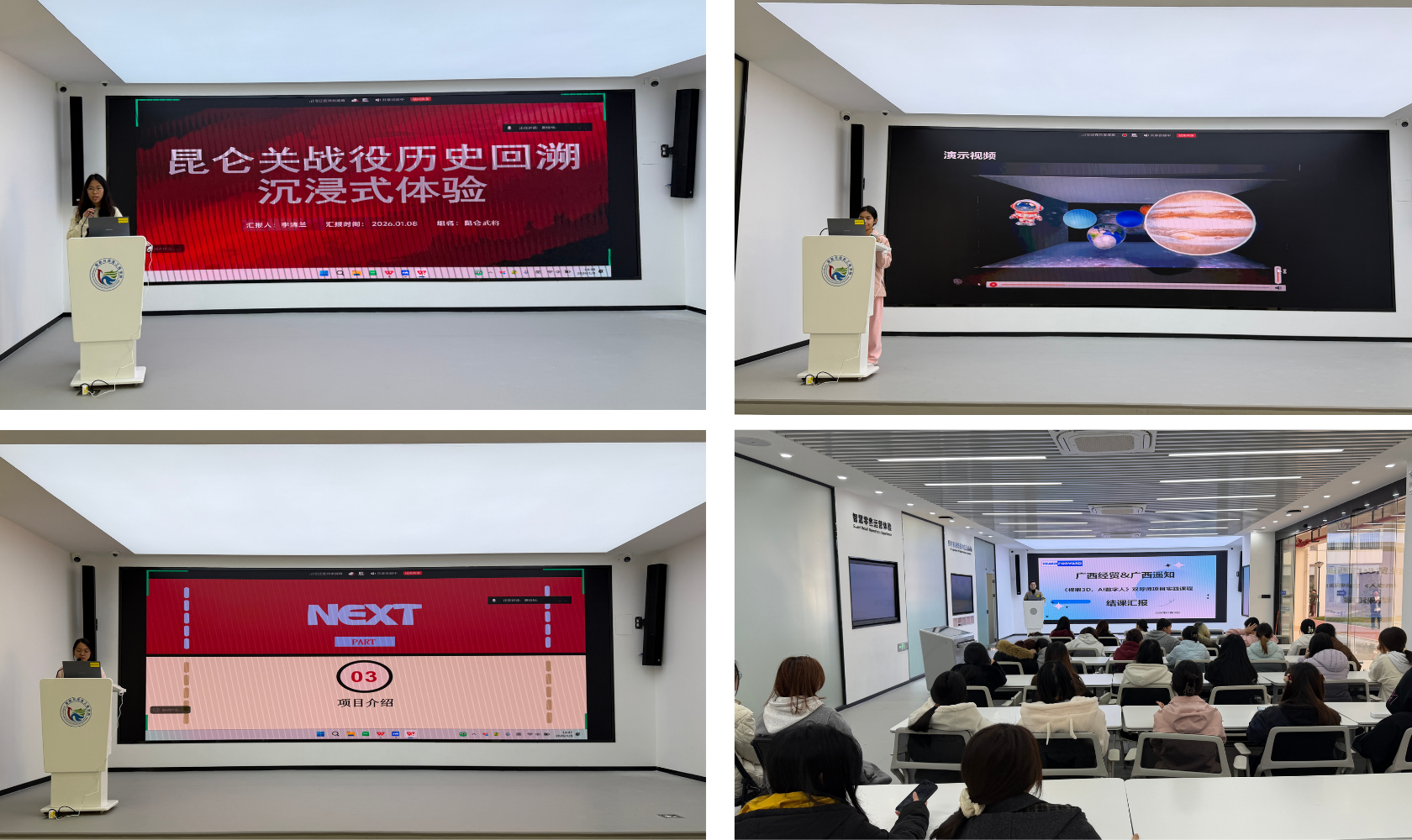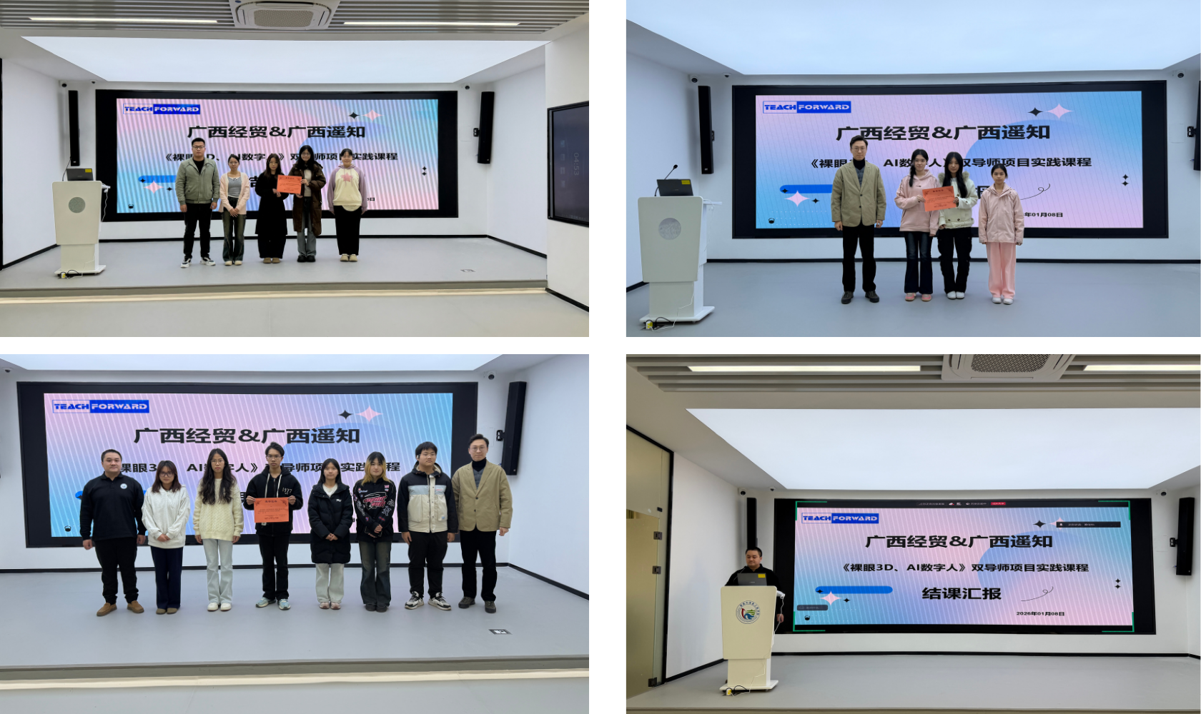 2026年1月8日下午,广西经贸职业技术学院2024级数字媒体技术专业“裸眼3D、AI数字人”双导师项目实践课结课汇报会成功举行。本次活动是学校深化产教融合、探索校企协同育人模式的又一重要成果,标志着数字媒体技术专业在实践教学改革上迈出了坚实步伐。