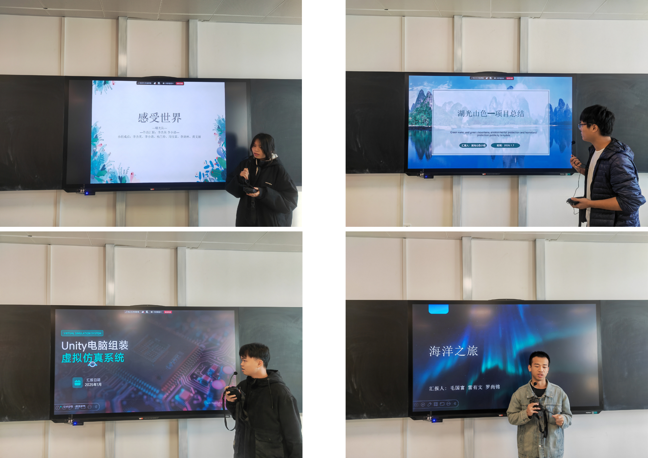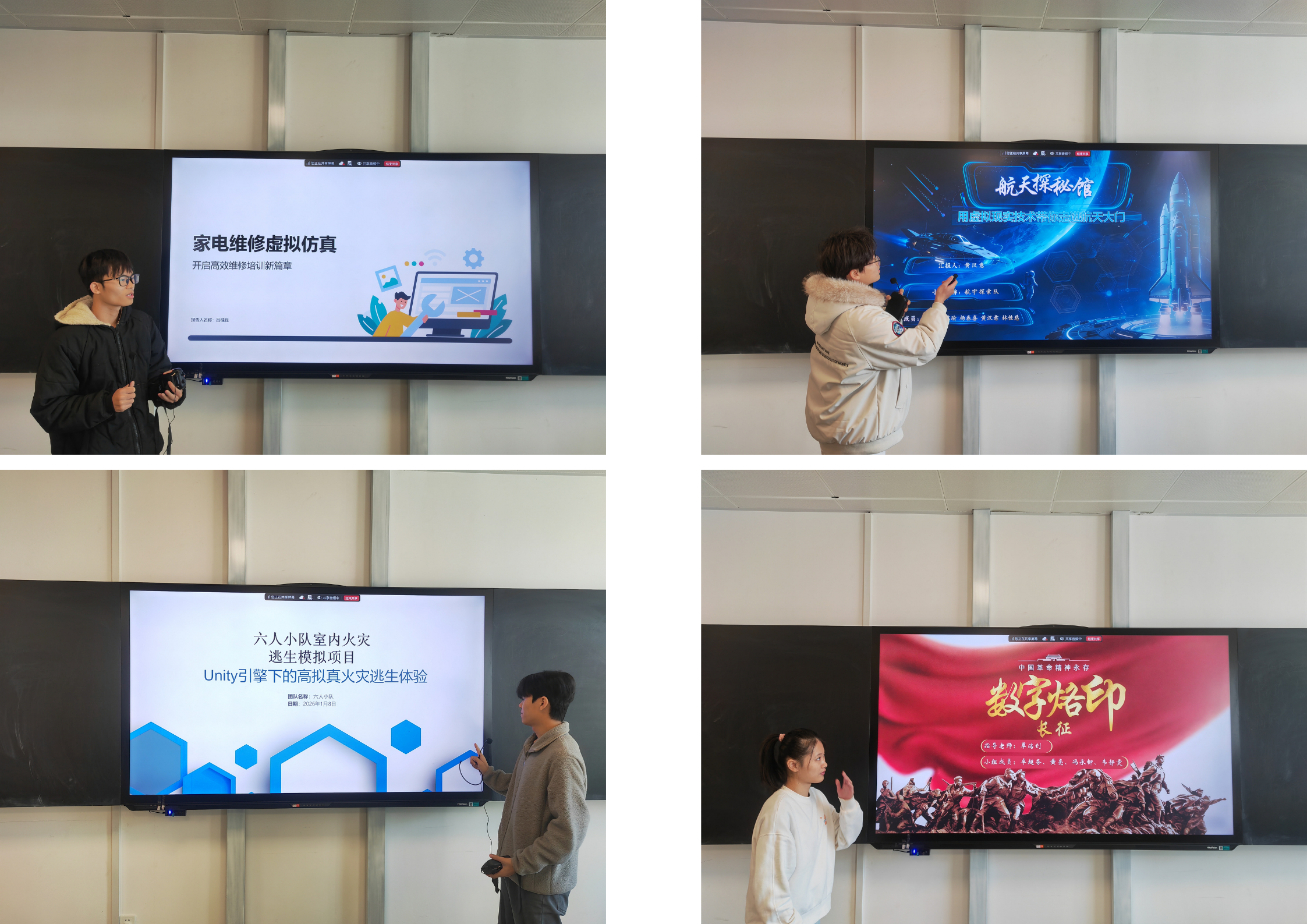 在结课答辩现场,共8组优秀作品进行了集中展示与汇报。其中,《航天探秘馆》《数字烙印长征》《Unity引擎下的高拟真火灾逃生体验》三组作品因创意新颖、技术实现完整、交互体验出色,分别荣获一、二、三等奖。