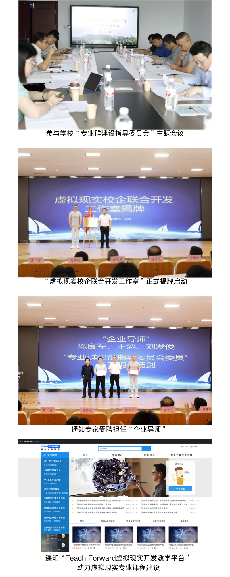 校企双方成立“虚拟现实校企联合开发工作室”,遥知“Teach Forward虚拟现实开发教学平台”助力虚拟现实专业课程建设,从VR开发引擎、开发插件、VR硬件开发和VR项目开发等方面,全面支持老师教学和学生学习实训。