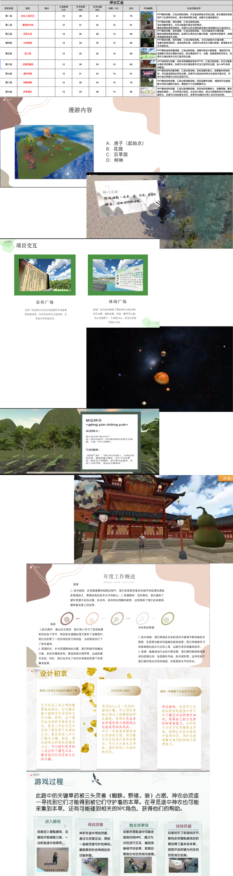 同学们分成9组,顺利完成9组作品,分别有《欢乐小岛时光》、《漫游美术馆》、《百草之灵》、《古迹探险》、《逛三园》、《古建筑漫游》、《星际学旅》、《田畴语韵》和《四季漫步》,选题包括中草药科普、行星科普、文化历史介绍、古建筑介绍等等,选题有意义,同学们的作品开发相对较完整,交互功能、体验感也在短时间的开发过程中体现了水平。一起来看看吧