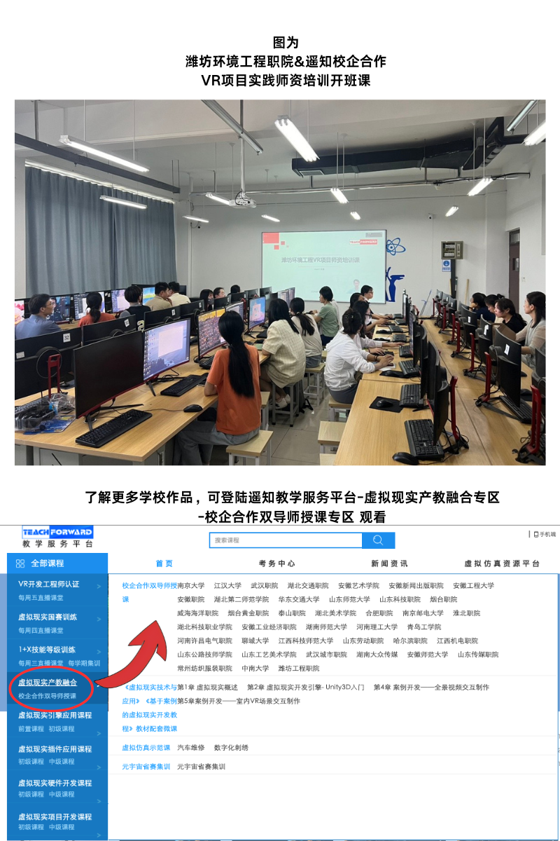 遥知“校企合作双导师项目实践”将进入本学期最后冲刺阶段!本周新增山东电子职院、潍坊环境工程职院2所学校开课,开展校园全景漫游交互项目和VR室外漫游交互项目的开发与实践。