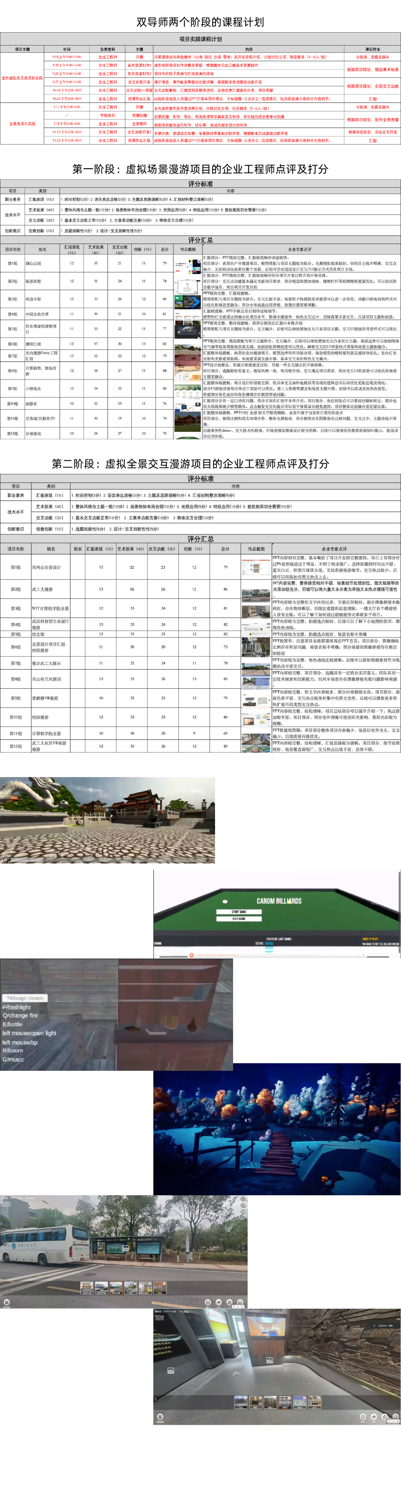 武汉工程大学9月18日-10月25日完成第一阶段12项“虚拟场景漫游项目”的双导师实践;11月1日-11月25日完成第二阶段12项“虚拟全景交互漫游项目”的双导师实践。