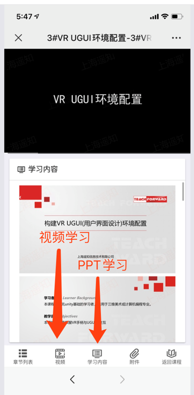 点击“开始学习”即可进行手机端学习。学习中,可以选择“视频”与“学习内容”相互切换。学习不同的知识。