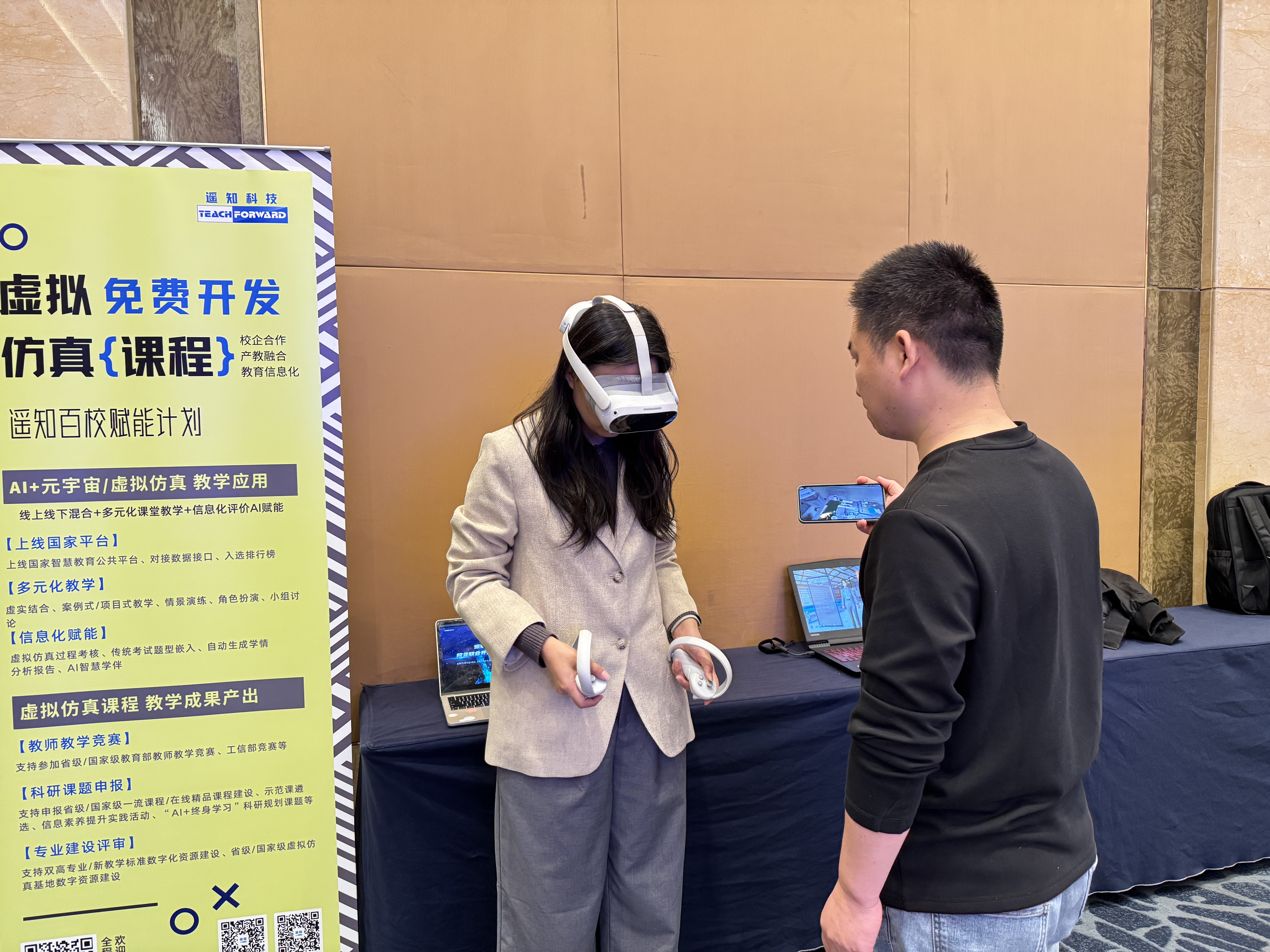 遥知还在现场展示了虚拟仿真课程开发解决方案,吸引了一众教育专家与一线教学团队的兴趣和体验。