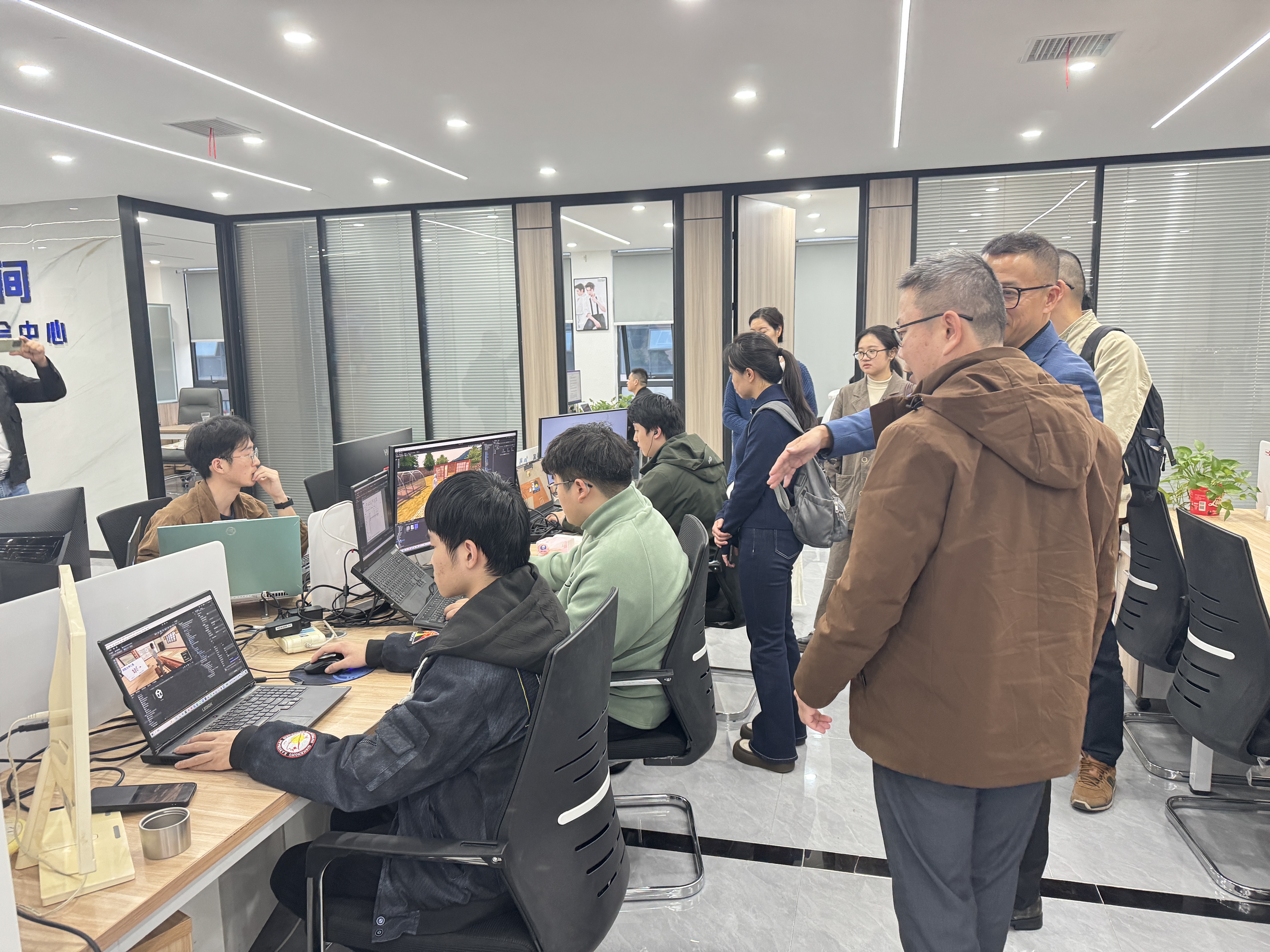 在江汉大学教育学院数字媒体技术专业,考察团深入观摩了校企共建的虚拟现实协同育人产教融合基地。江汉大学通过与遥知的校企合作双导师制,实现理论教学与产业实践的深度衔接,获得不少教学成果。