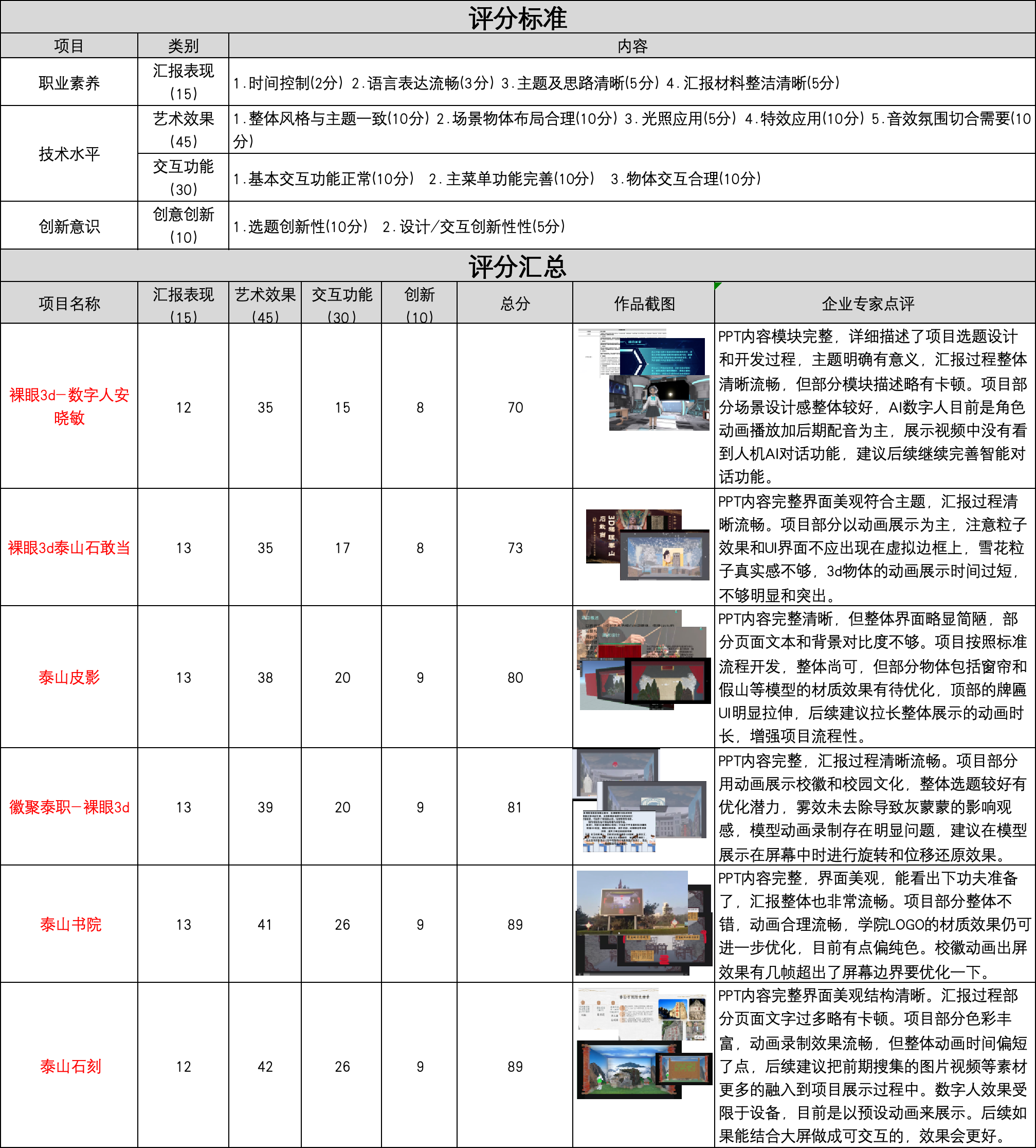 答辩会上,学生团队通过项目路演、作品演示,展示了扎实的技术应用能力与创意设计思维,为泰山文旅数字化提供了新颖的呈现方案。