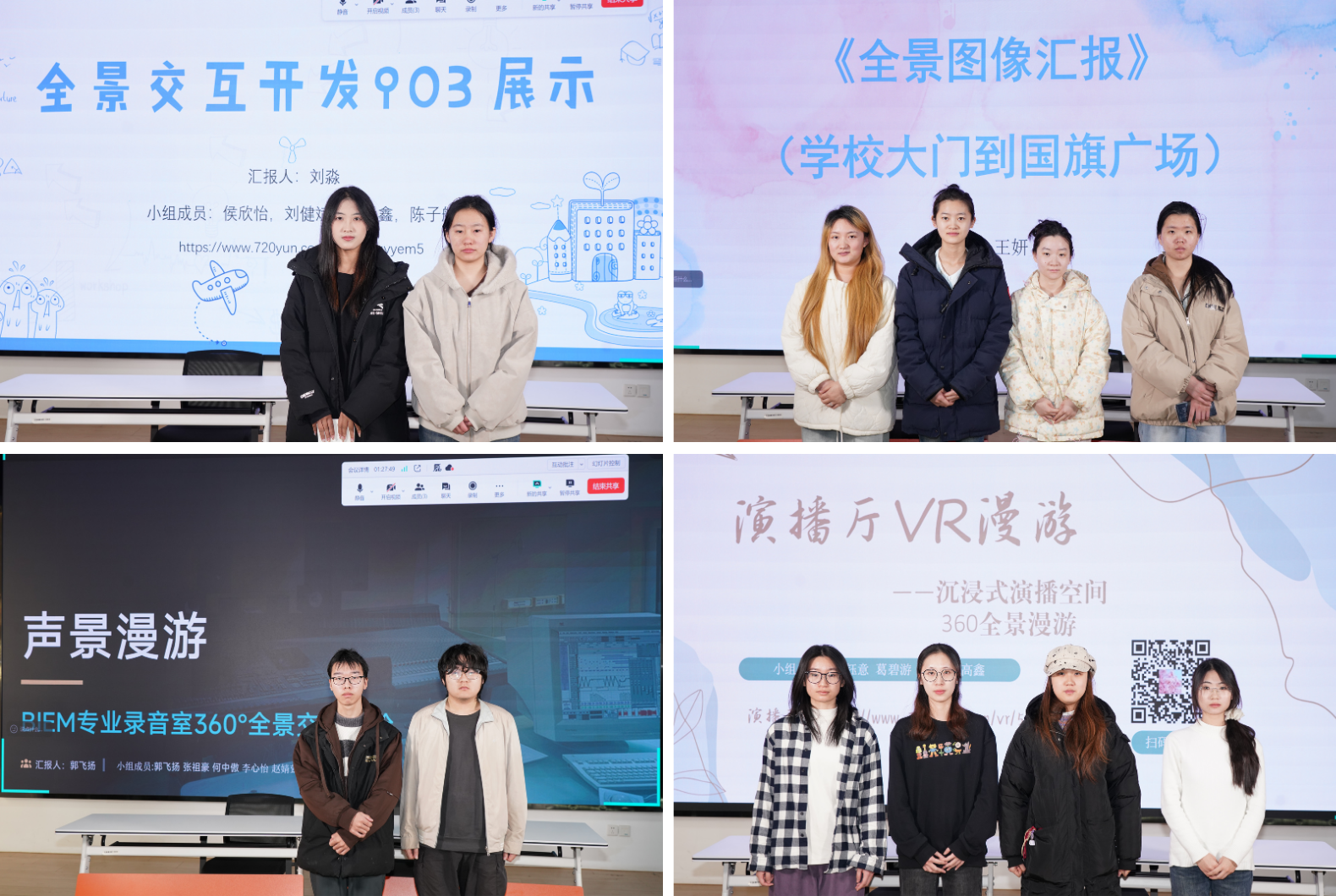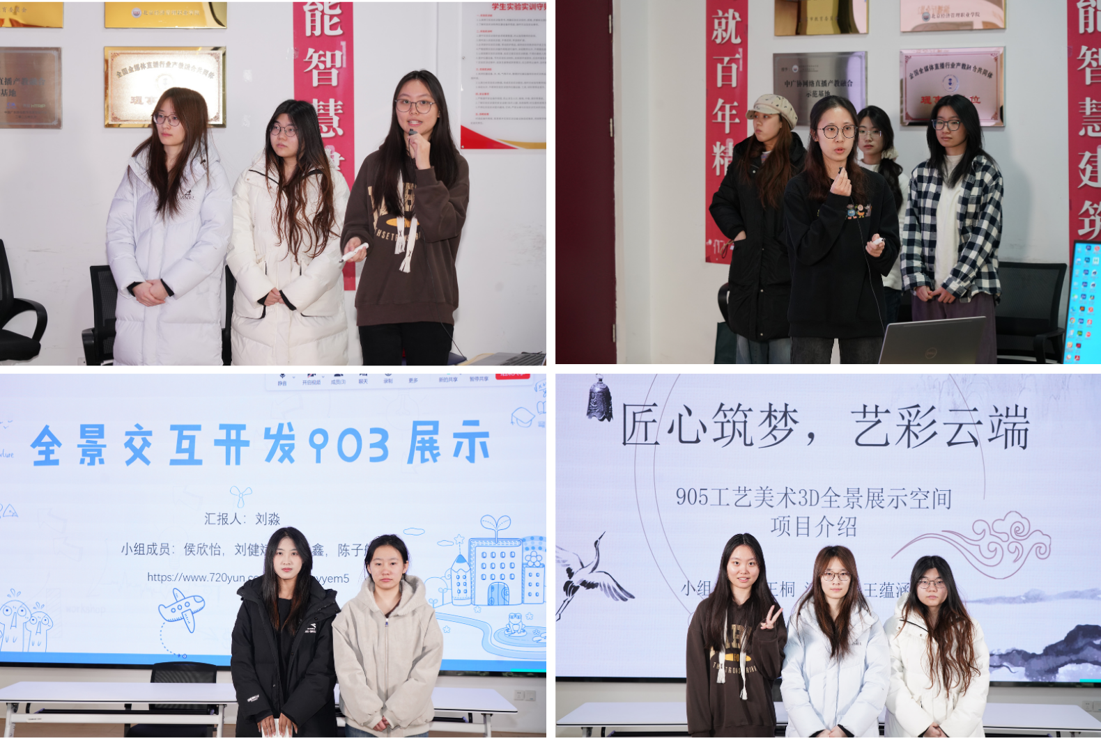 接下来是本次校赛决赛,现场气氛热烈。参赛学生以小组形式,依次展示了他们精心创作的虚拟现实技术应用作品。这些作品构思新颖,技术应用娴熟,充分展现了学生们将前沿VR全景数字技术与艺术设计相融合的创新能力和实践水平。比赛基于“遥知双导师项目实践服务”平台开展,得到了遥知在技术层面的全程支持,是校企协同育人模式的一次生动实践。