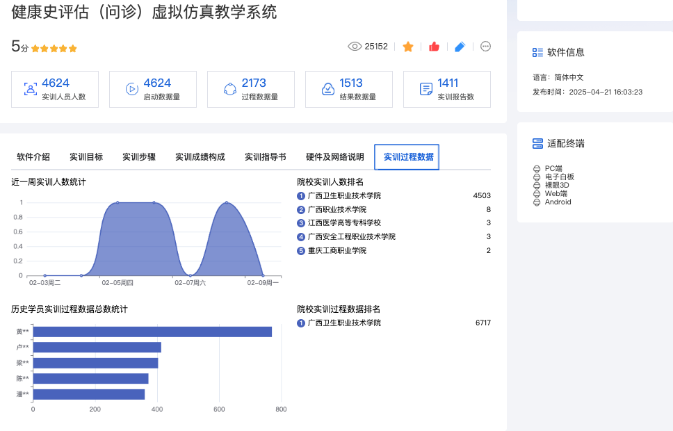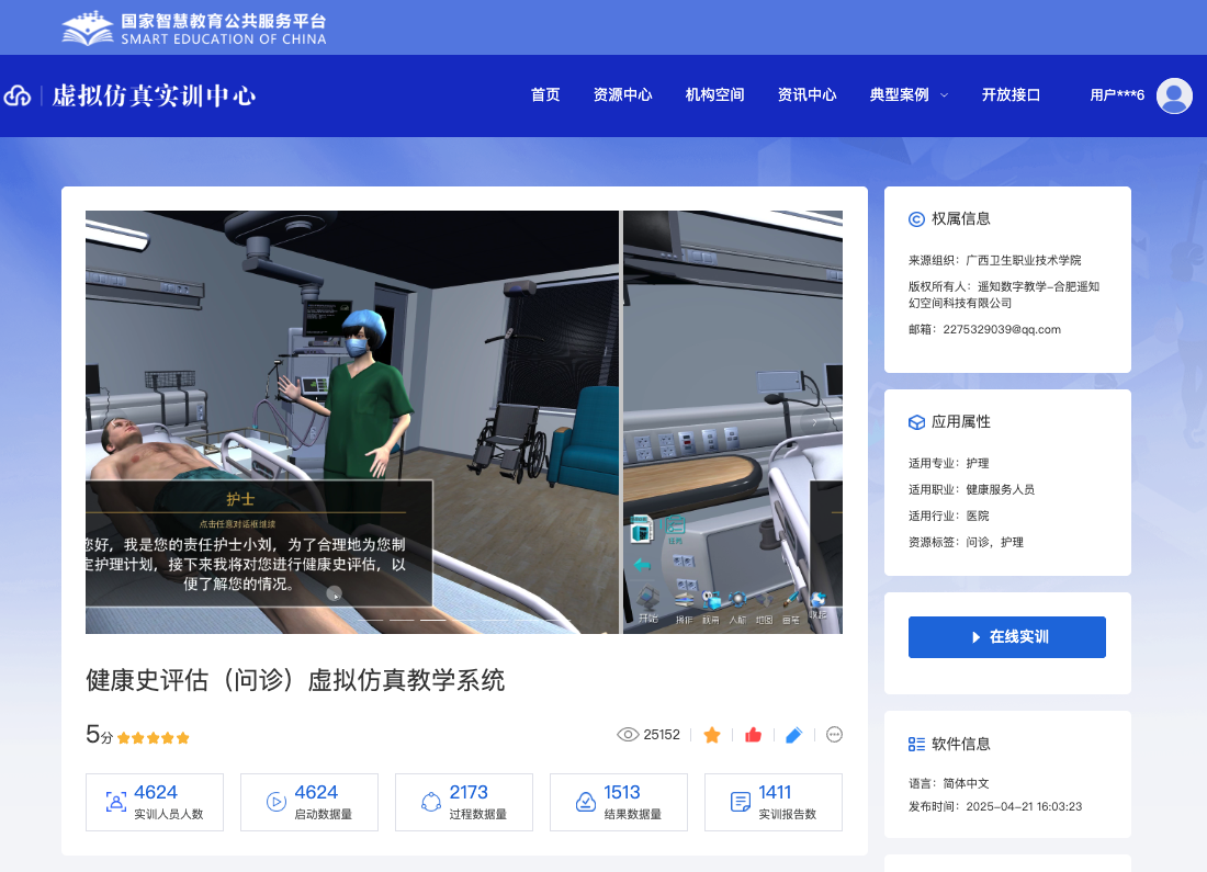 遥知支持广西卫生职业技术学院开发的《健康史评估(问诊)虚拟仿真教学系统》虚拟仿真课程、苏州工业园区工业技术学校《网络综合布线》虚拟仿真课程,被国家智慧教育公共服务平台“资源中心”-“热门虚仿实训”推荐,并在各类排行榜单上名列前茅。