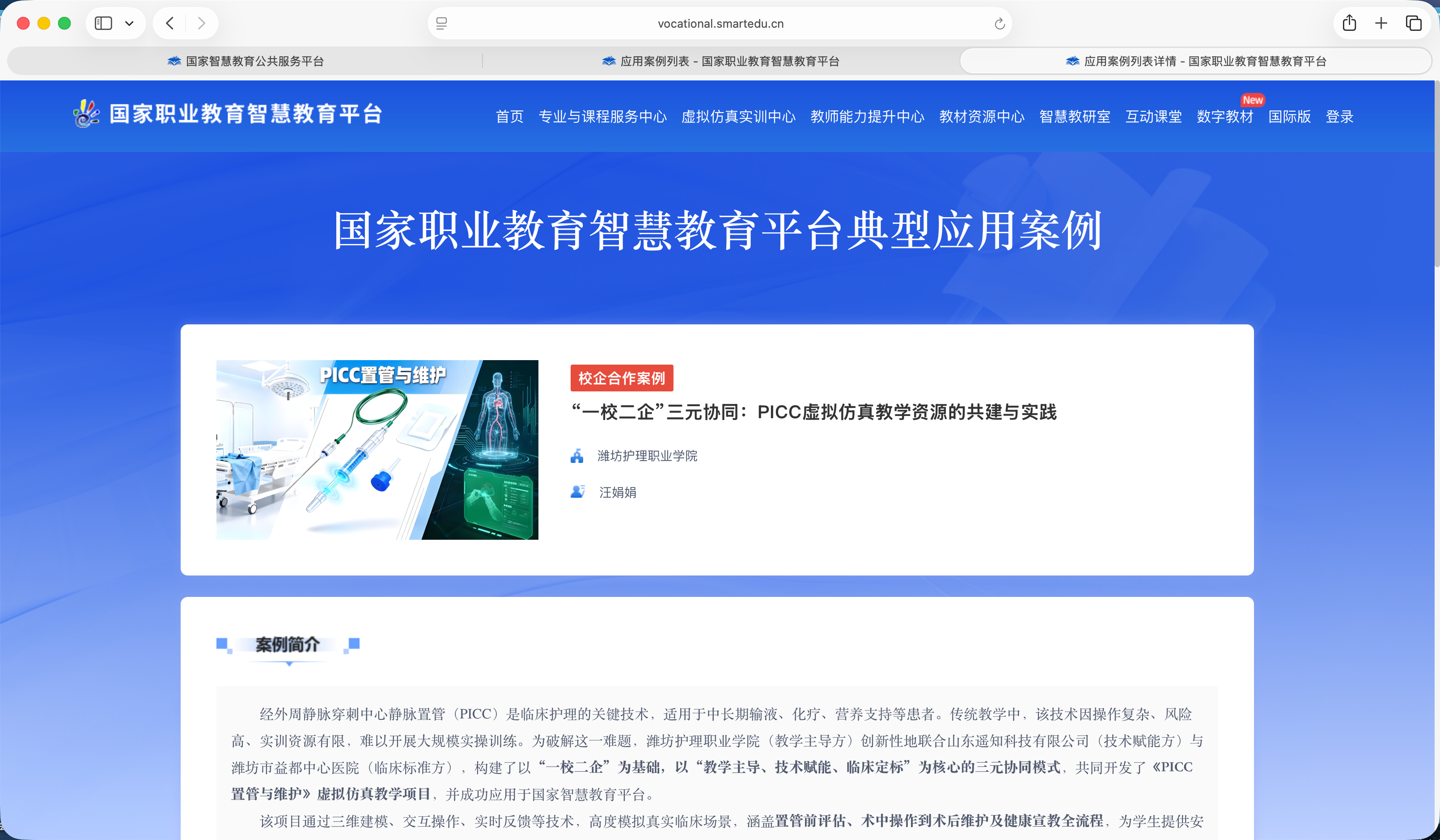此次入选的课程包括校企合作案例《“一校二企”三元协同:PICC虚拟仿真教学资源的共建与实践》和教学应用案例《数字赋能:急性心梗“诊-救-护”全流程虚实融合实训案例》。