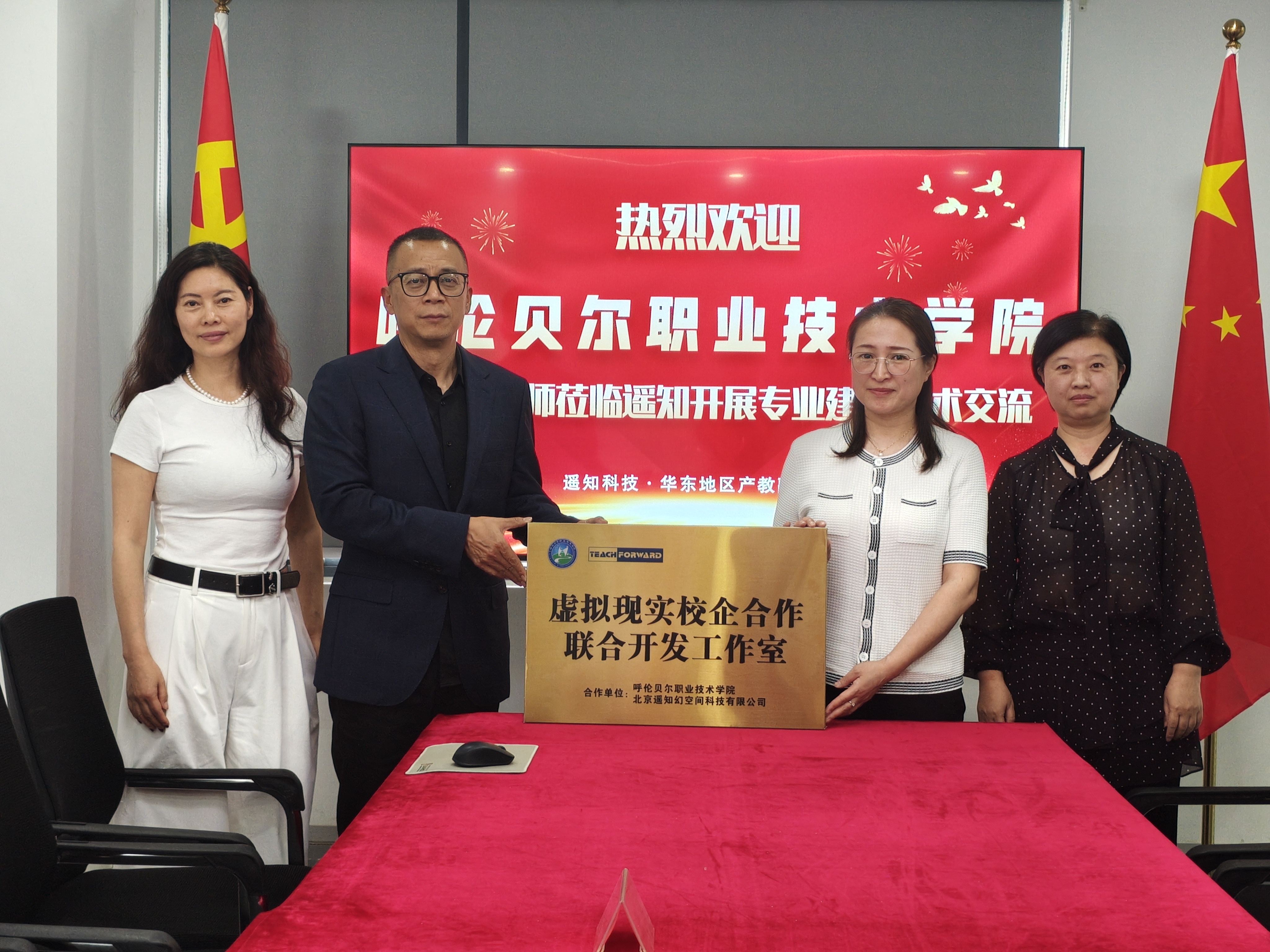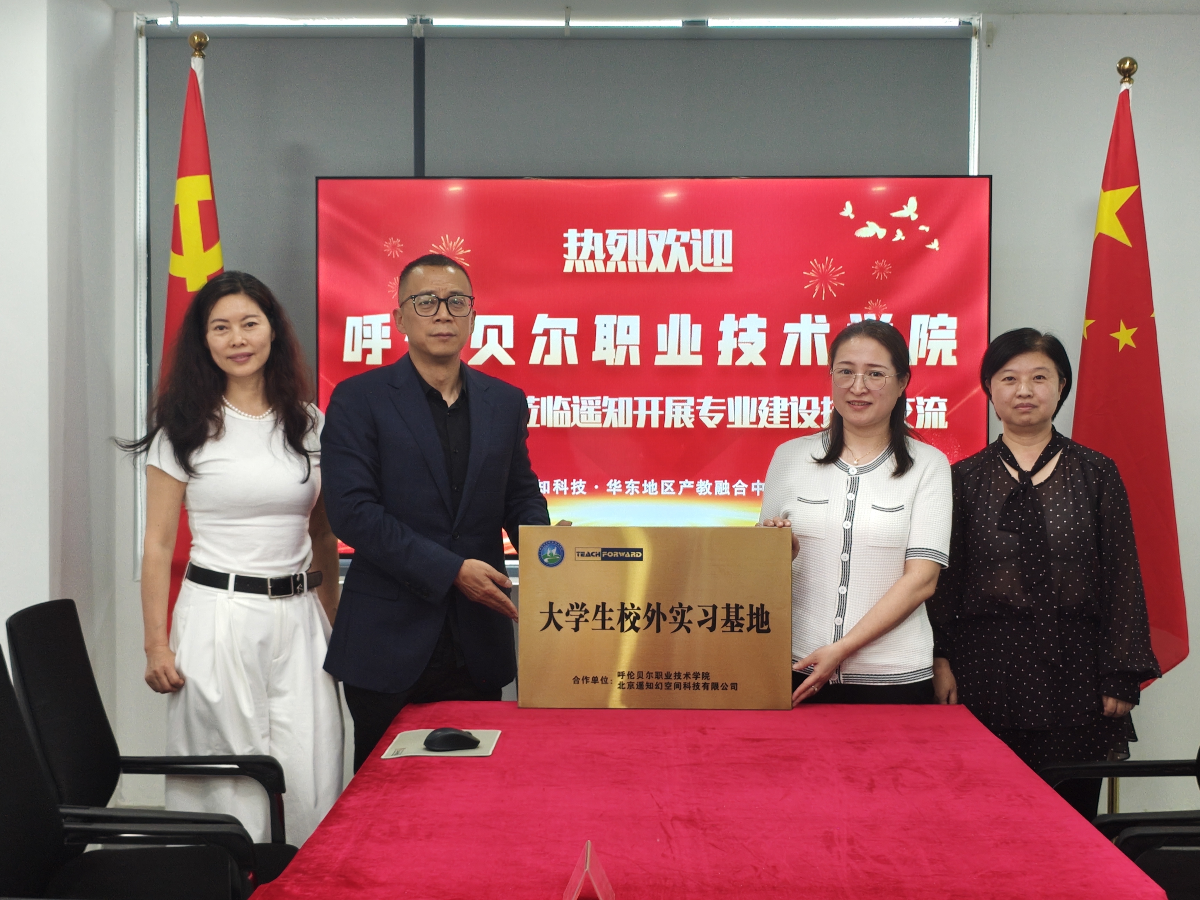 近日,呼伦贝尔职业技术学院一行来访遥知科技华东地区产教融合基地,双方正式挂牌成立"虚拟现实校企合作联合开发工作室"及"大学生校外实习基地",标志着校企深度产教融合合作全面启动。